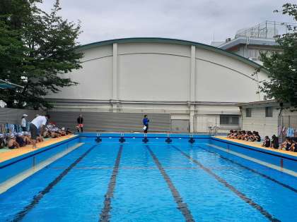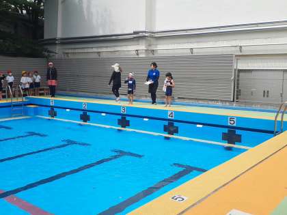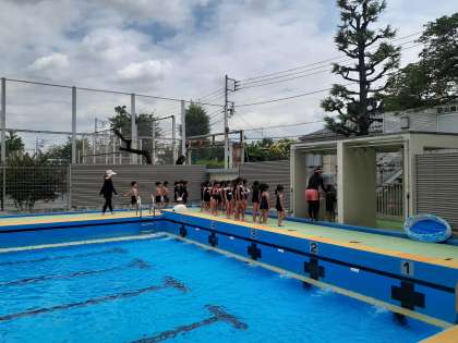 クラスの代表児童がプールの目標をのべ、「泳げるようになりたいです」と話していました。