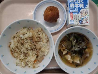 ・豚肉とごぼうの炊き込みご飯 ・もずくのすまし汁 ・サーターアンダギー ・牛乳