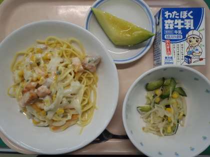 ・鮭のクリームスパゲティ ・キャベツとコーンのサラダ ・果物(メロン) ・牛乳