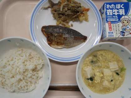 ・ごまごはん ・アジのレモン醤油焼き こんにゃくと茎わかめの金平 ・かきたま汁 ・牛乳