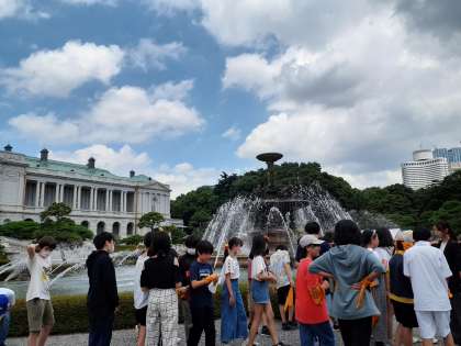 噴水のそばでクラスごとに写真をとりました。