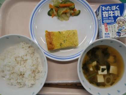 ・ごはん ・トビウオ入り卵焼き ・野菜の梅ごまだれ ・みそ汁 ・牛乳