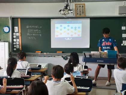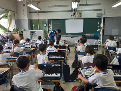 「きらきらぼし」のはじめの2小節に続く2小節を考えました。自分たちで考えた旋律をロイロノートで共有し、みんなで演奏しました。