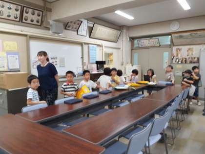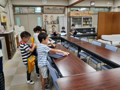 「校長先生はいつもどんな仕事をしているのですか。」「休みの日は何をしていますか」「なん代目の校長先生ですか」「金庫には何がはいっているのですか」「なんで、ぬいぐるみが置いてあるのですか」とたくさん質問をしていました。