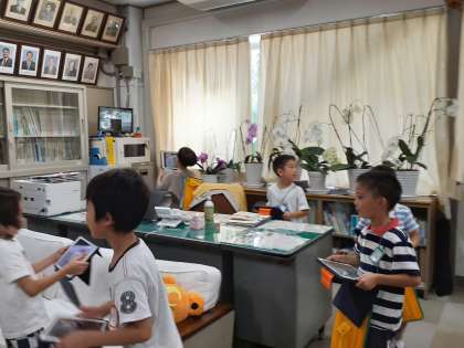 1年生は生活科の学習で学校探検をしました。「校長室はどうなってるか知りたい」ということで、代表の児童がタブレットを持ってインタビューに来ました。