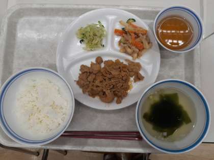 ごはん、豚肉のしょうが焼き、キャベツ、わかめスープ、マカロニツナサラダ