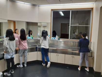 寝る支度をしています。はみがきだけでなく、洗顔クリームで