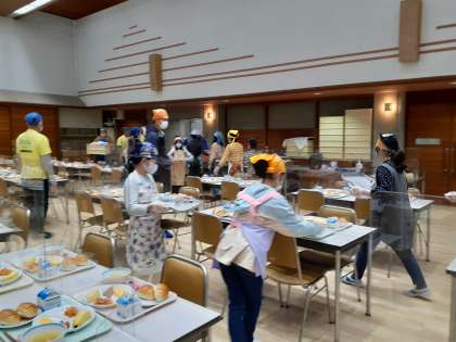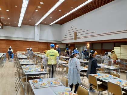 朝会のあと、食事係が朝食の準備をしています。