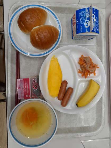 朝食のメニューは、ロールパン、イチゴジャム、牛乳、人参とツナのサラダ、オムレツ、ソーセージ、野菜スープ