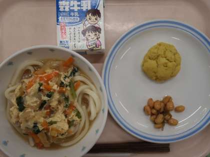 9月29日の給食 公開日 2023/09/29 更新日 2023/09/29 給食 ・親子うどん ・昆布豆 ・お月見スイートポテト ・牛乳 にんじん・玉ねぎ(北海道)鶏肉(宮崎) 卵・長ねぎ(青森) 小松菜(埼玉) さつまいも(千葉) 今日は十五夜です。お月見にちなんで、スイートポテトを月のように丸く形成して焼きました。お月様のように、きれいな黄色のスイートポテトになりました。 秋は空気が澄んで、夜空に星や月がきれいに輝いて見える季節です。 いいね(0)