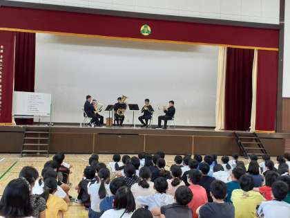 体育館で、アウトリーチ型プログラム「管楽器五重奏」がおこなわれました。トランペット、トロンボーン、ホルン、チューバの4つの楽器について、音の違いについて教えていただきました。
