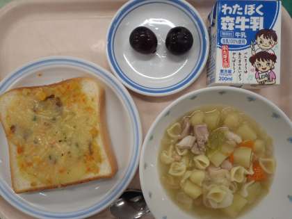・クロックムッシュ風トースト ・鶏肉のポトフ ・果物(ぶどう) ・牛乳