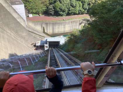 バスを降りたあとはインクラインに乗りました。登っていく急勾配が怖かったようです。