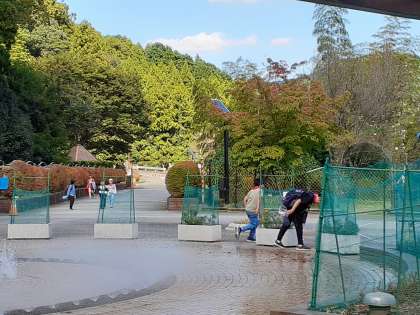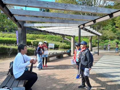 ビンゴを完成するためには、先生を見つけてミッションをクリアしなくてはいけません。じゃんけんに勝つこと、校歌を歌うこと、同じグループの人の良いところを言う、などミッションに取り組みました。ミッションをクリアする合間には、カマキリをみつけたり、噴水で戯れたりして楽しんでいました。