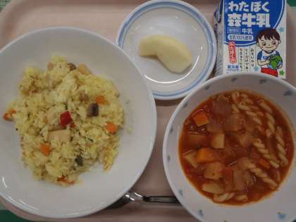 ・パエリア ・トマトと豚肉のスープ ・果物(りんご) ・牛乳