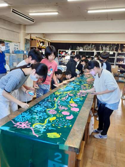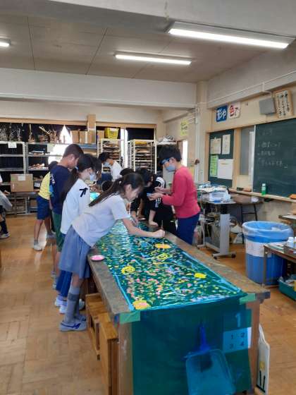 図工室の様子です。6年生が何やら楽しそうに長い緑のシートに絵を描いています。声をかけたら、