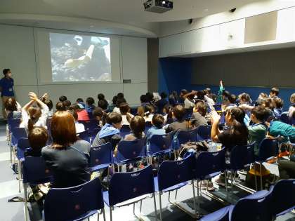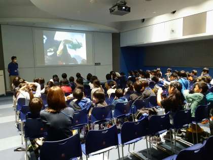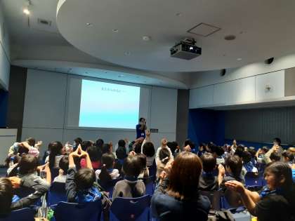 「クロマグロの顔を前から見たら、どんな形かな」「ウツボってどんなふうに泳ぐのかな、やってみせてくれるかな」と問いかけられ、可愛らしくやって見せてくれる1年生、微笑ましい姿でした。
