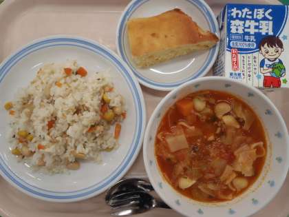 ・ツナと大豆のピラフ ・ミネストローネ ・ぐりとぐらのカステラ ・牛乳