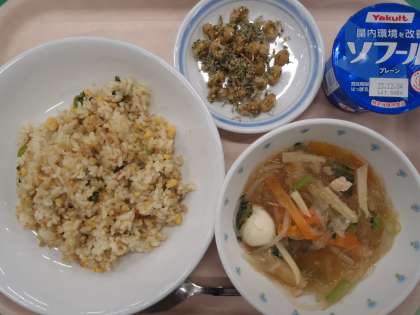 11月18日の給食 公開日 2023/11/18 更新日 2023/11/18 給食 ・青菜と卵のチャーハン ・春雨スープ ・のり塩じゃこ大豆 ・ヨーグルト ・牛乳 たまご(青森) にんじん(千葉) たけのこ(熊本) 鶏ひき肉(宮崎) 長ねぎ(青森) 小松菜(埼玉) もやし(静岡) しょうが(高知) スープには5種類の野菜と、肉、春雨、うずら卵が入っています。陽が出ると暖かいですが、気温が低くなってきました。風邪予防のためにも、しっかりと食べて栄養を補給してほしいと思います。 いいね(0)