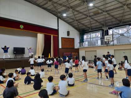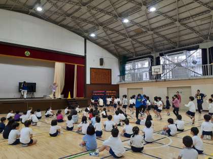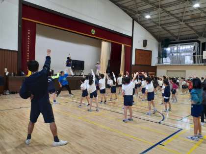 3.4時間目に、2年生が体育館でエンブレムのダンサーの方々にダンスを教えていただきました。じゃんけんポーズを入れたノリの良い曲に合わせて、子どもたちはもちろん、担任の先生方も、かっこよく踊りました。