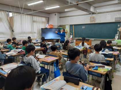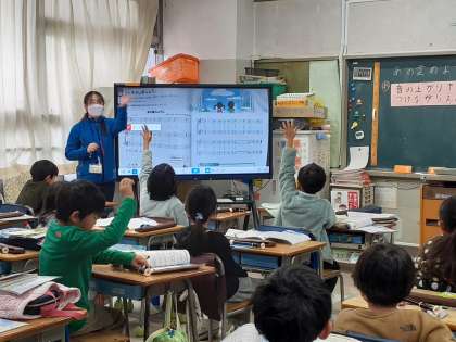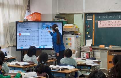 大型スクリーンで、楽譜を写し、どの部分に気を付けるのかを確認していました。先生が手本を見せると「わあ、先生、上手」と子どもたちからの声が響いていました。