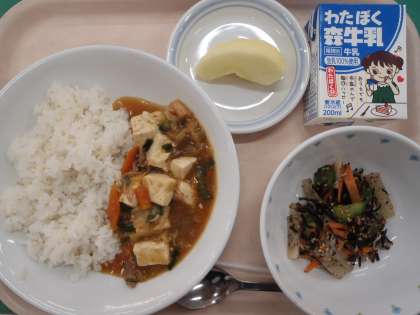 ・ごはん ・豆腐のチゲ風煮 ・大根とじゃこの中華和え ・果物(りんご) ・牛乳