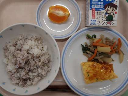 ・ゆかりじゃこごはん 擬製豆腐あんかけ ・じゃがいもの五目炒め ・果物(早香) ・牛乳