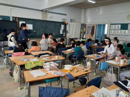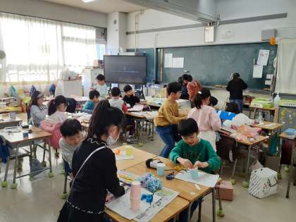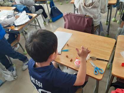 1年生の生活科で、どんぐりパーティーを行いましたが、その第2弾に向けて、準備をしています。どんぐりゴマ、けん玉、パチンコなど、わいわいと話し合いながら作っていました。