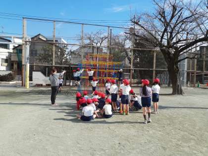 休み時間には小校庭を利用する学年が使えます。一年生は、体育の授業でルールを確認していました。