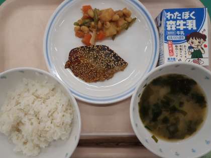 ・ごはん ・鯖の南部焼き ・変わり五目豆 ・みそ汁 ・牛乳
