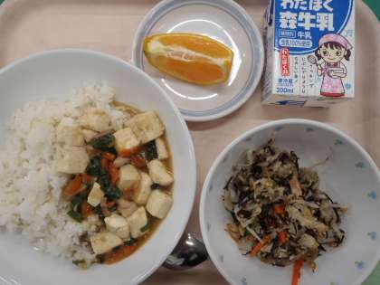 ・ごはん ・五目豆腐 ・あげごぼうの中華和え ・果物(デコポン) ・牛乳