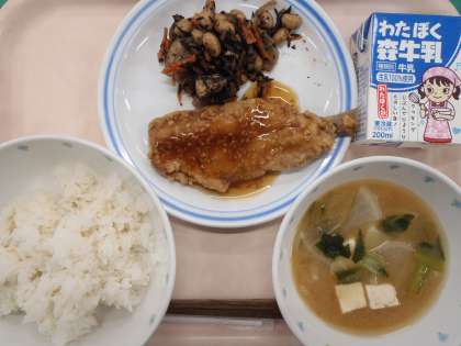 ・ごはん ・いわしのかば焼き ・大豆入りひじきの煮物 ・具だくさんのみそ汁 ・牛乳