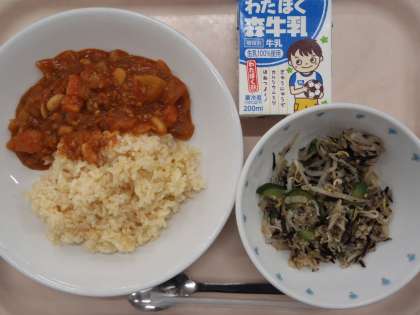 2月7日の給食 公開日 2024/02/07 更新日 2024/02/07 給食 ・チリビーンズライス ・もやしとひじきのサラダ ・牛乳 にんにく(青森) 豚ひき肉(群馬) 玉ねぎ(北海道) にんじん(千葉) じゃがいも(北海道) パセリ(千葉) もやし(栃木) きゅうり(群馬) 玉ねぎ、にんじん、じゃがいもとひき肉、2種類の豆、トマトを煮込みソースにしてご飯と一緒に食べるチリビーンズライスです。チリパウダーでアクセントを付けました。 いいね(0)