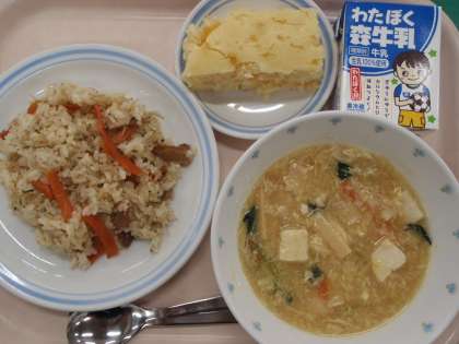 ・じゃこべぇピラフ ・中華風コーンスープ ・桃のケーキ ・牛乳