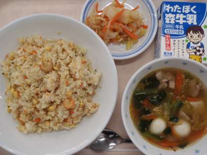 ・五目チャーハン ・キムチとごまの中華スープ ・白菜の中華漬け ・牛乳