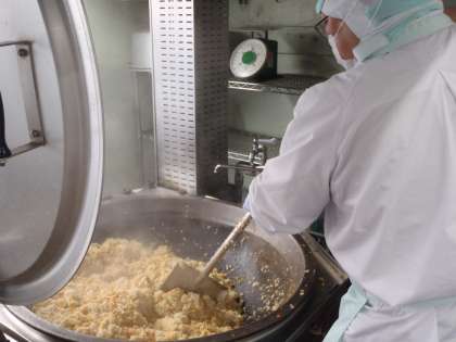 給食では数回に分けて、具材とごはんを混ぜあわせます。それでも大量なので、混ぜあわせるのは大変な作業です。調理員さんは大きなヘラでまんべんなく混ぜ合わせてくれます。