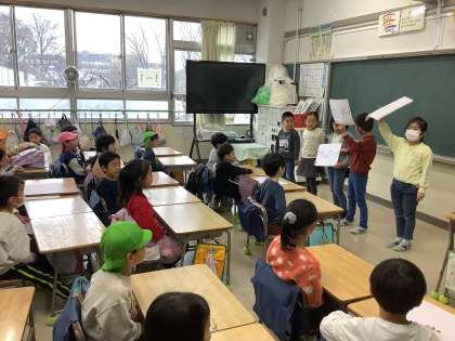 【1年生】保育園訪問 公開日 2024/02/21 更新日 2024/02/21 今日のできごと 来年1年生になる、保育園の子どもたちが遊びに来ました。 教室で学校紹介をした後、体育館に移動してじゃんけん列車をしました。 1年生は緊張しながらも、張り切って交流していました。 いいね(0)