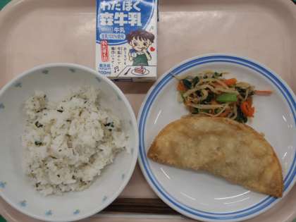 ・じゃこわかめごはん ・ジャンボぎょうざ ・野菜のごま酢和え ・牛乳
