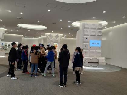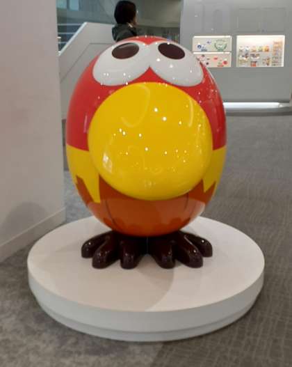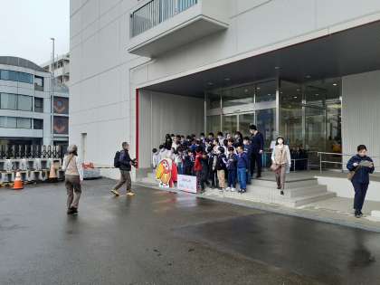 森永製菓につくと、ミュージアムの前で集合写真をとり、クラスごとに見学。工場では、キョロちゃんが待っていました。