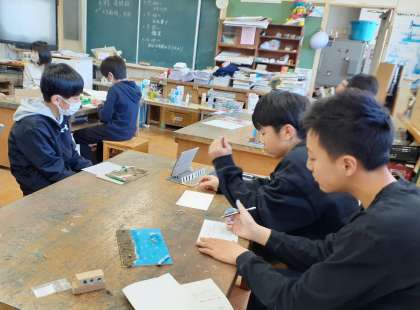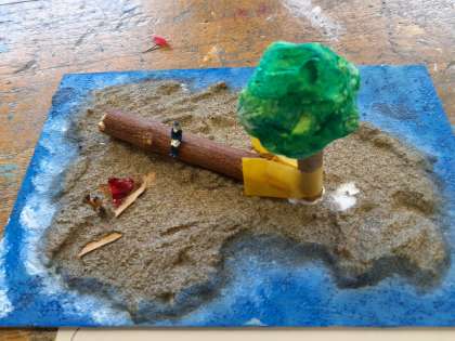 図工最後の授業「人生劇場」、2人がどんな場面で出会ったのかをドラマの一場面を想い描いて作品にしました。