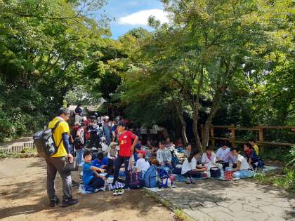 12時を過ぎた頃、ようやく高尾山の山頂に到着。クラス写真をとったあと、木陰でランチタイム。
