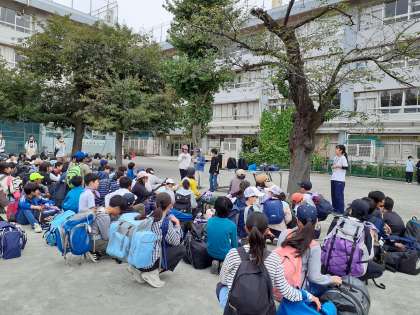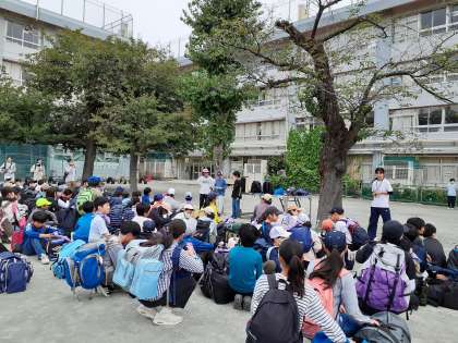 お天気が心配されましたが、何とかもちそうです。校庭で出発式を行い、駒沢公園から、バスに乗って出発しました。