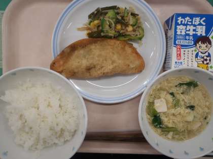 ・ごはん ・ジャンボぎょうざ ・かみかみサラダ ・かきたま汁 ・牛乳