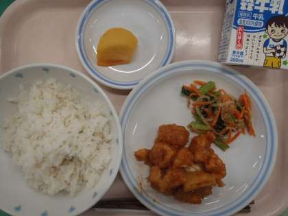 10月15日の給食 公開日 2024/10/15 更新日 2024/10/15 給食 ・ごはん ・魚のチリソース ・野菜の中華ごまだれ和え ・果物(柿) ・牛乳 たら(アメリカ) しょうが(高知) じゃがいも(北海道) にんにく(青森) 玉ねぎ(北海道) 小松菜(茨城) もやし(栃木) にんじん(北海道) 長ねぎ(青森) かき(奈良) 今日の主菜は、白身魚とじゃがいもにチリソースを絡めました。トウバンジャンやケチャップでチリソースを作りますが、辛さは控えめです。 いいね(0)