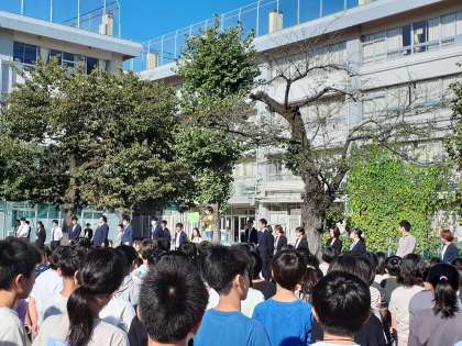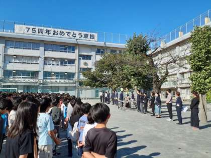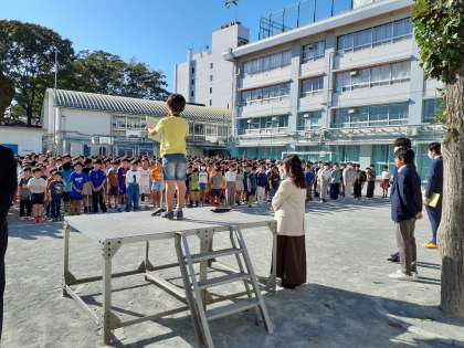 後期の始業式を校庭で行いました。3年生の代表児童が後期の抱負を述べました。