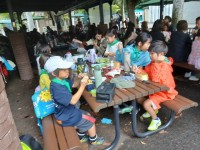 スタンプラリーの後は、おたのしみのお弁当。雨は降っていませんでしたが、屋根の下の...