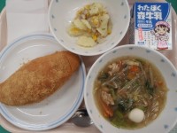 ・きなこ揚げパン ・春雨スープ ・ホットベーコンサラダ ・牛乳鶏肉(宮崎) もや...
