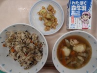 ・ひじきごはん ・のり塩ポテト大豆 ・きりたんぽ汁 ・牛乳鶏ひき肉(岩手) にん...
