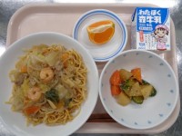【12月23日(火)献立】・五目あんかけ焼きそば ・中華風野菜 ・くだもの(早香) ・牛乳しょうが(高知県) にんにく(青森県) にんじん(千葉県) だいこん(神奈川県) たけのこ(国産) たまねぎ(...