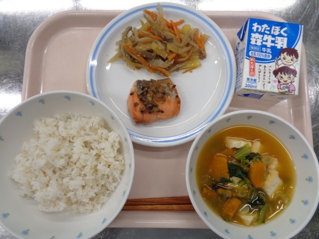 ・ごはん ・鮭の香味焼き ・五目きんぴら ・かぼちゃのみそ汁 ・牛乳